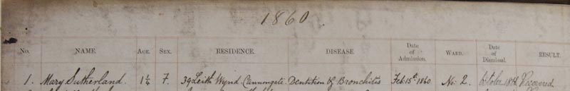 The Story of the 'Sick Kids' HospitalExtract from Register of In-patients showing Mary Sutherland's admission, 1860LHSA Ref: LHB5/5/1
